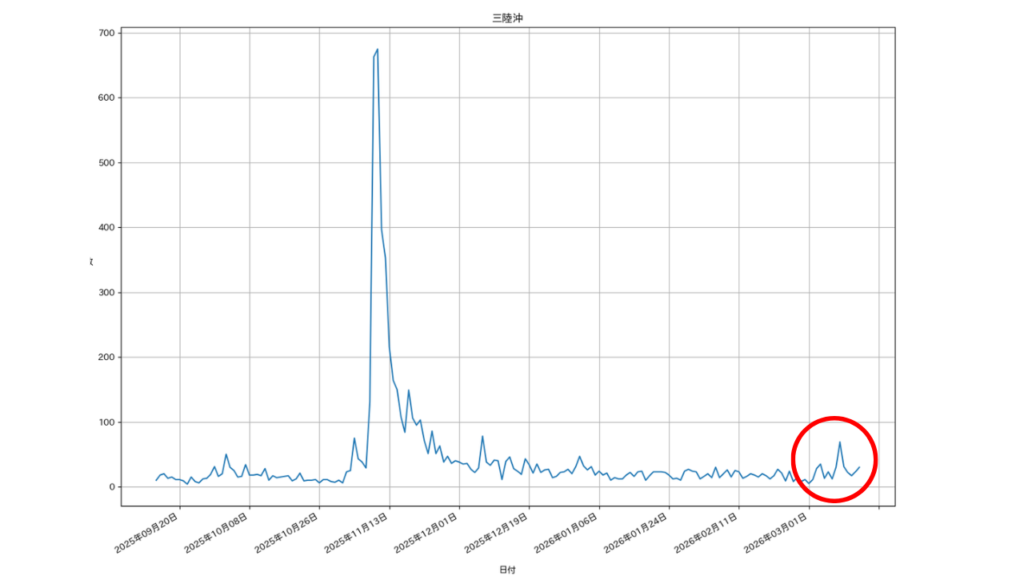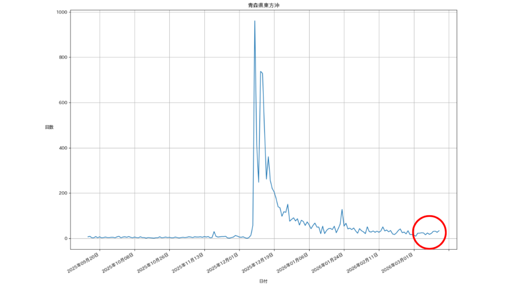 東北沖では去年の秋ごろから活発化し、11月にM6.9、12月にM7.5の大地震が発生しました。その後、減衰傾向ですが、現在も活発化している状態が継続しています。