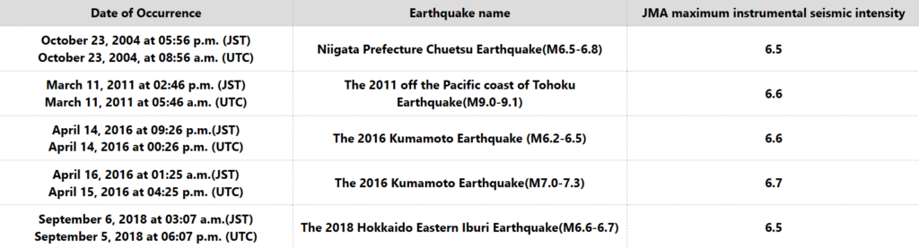 The earthquakes that have actually measured seismic intensity 7 on the instrumental seismic intensity scale are as follows.