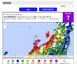 抜粋した画面は「能登半島地震における震源・震度情報」のデータ